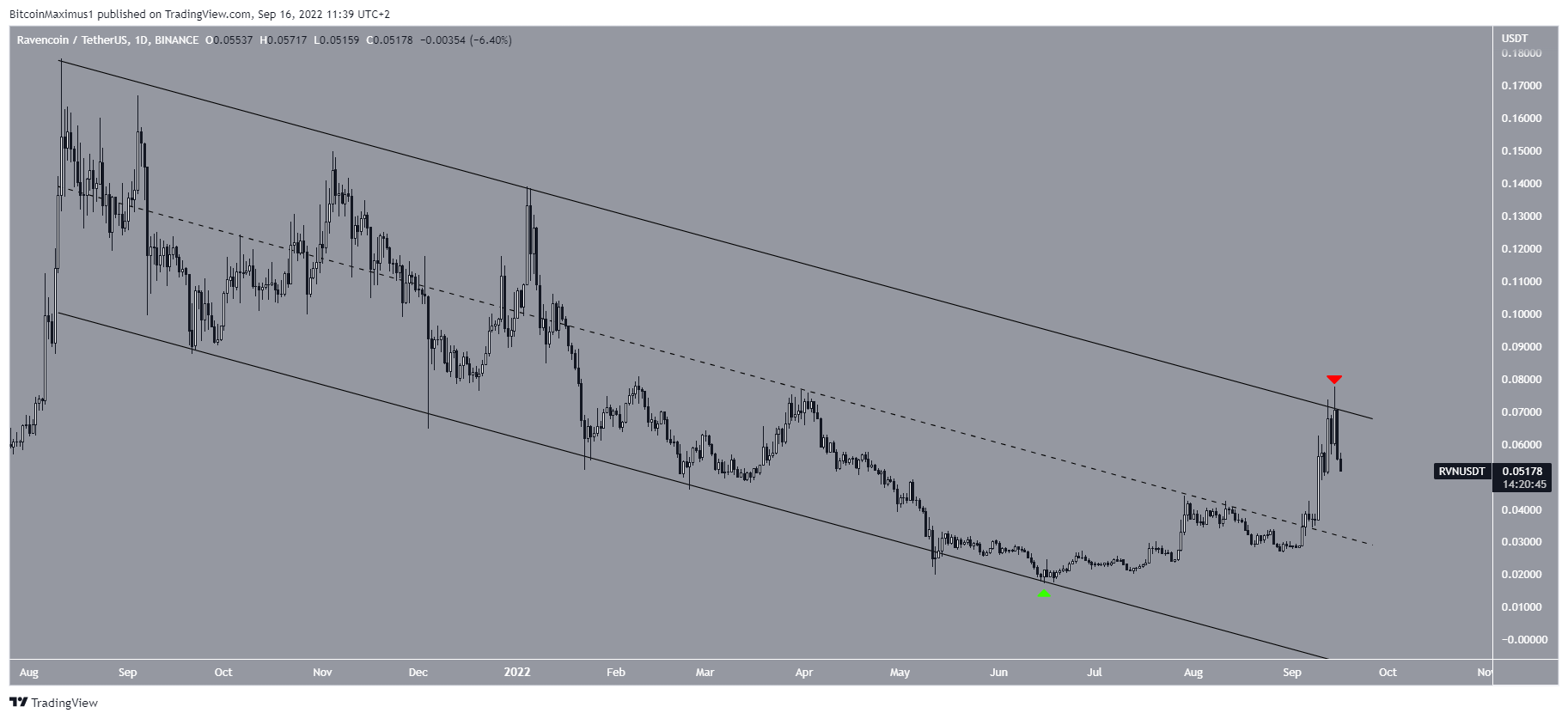 O preço do RVN vem caindo dentro de um canal paralelo de baixa de longo prazo desde agosto de 2021. O movimento levou a uma mínima de US$ 0,017 feita em junho. O token tem subido desde então e conseguiu recuperar o meio do canal em 5 de agosto.