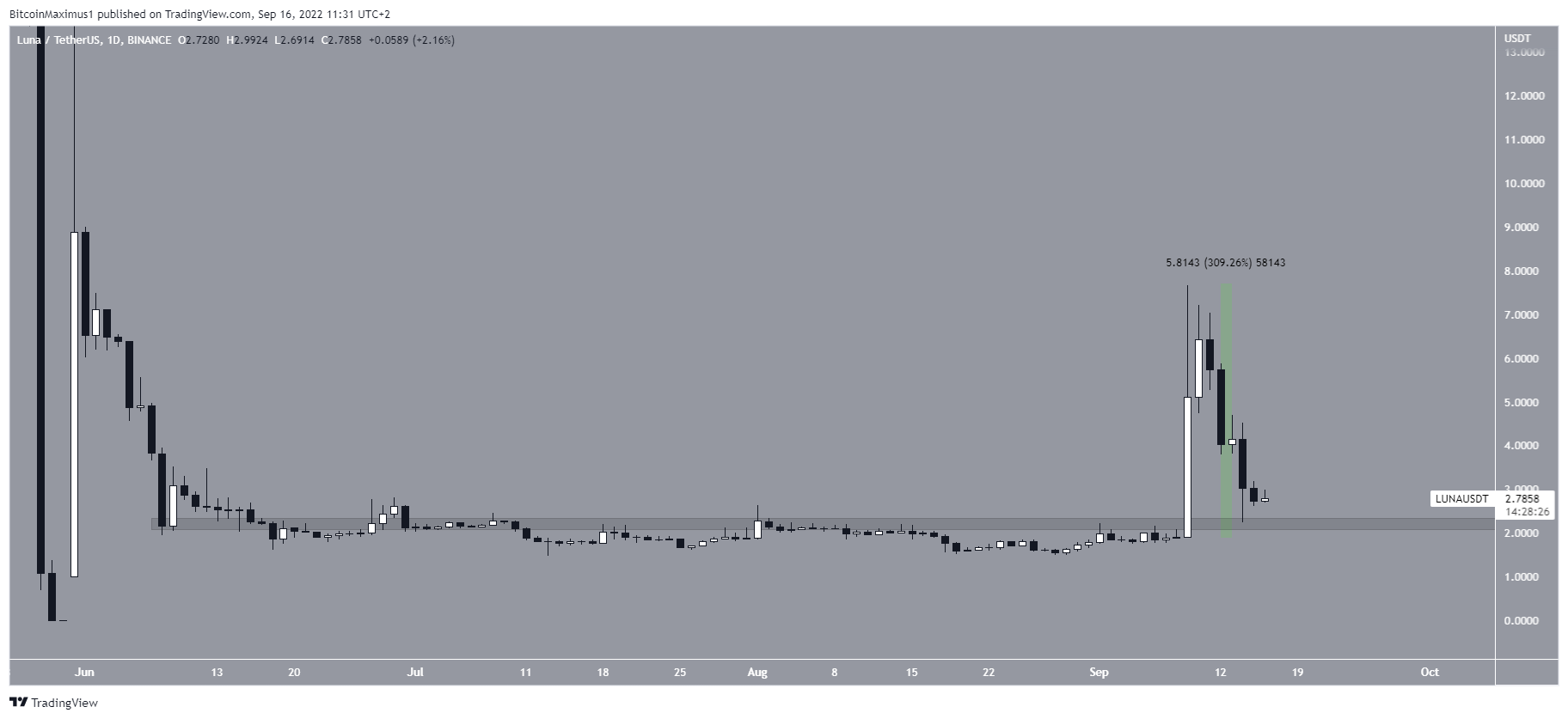 A LUNA estava sujeito a um grande movimento de alta em 9 de setembro, subindo 310% no mesmo dia e atingindo um topo de US$ 7,66. No entanto, esse movimento não pôde ser sustentado e o token criou uma sombra superior muito longa em seu candle no mesmo dia.