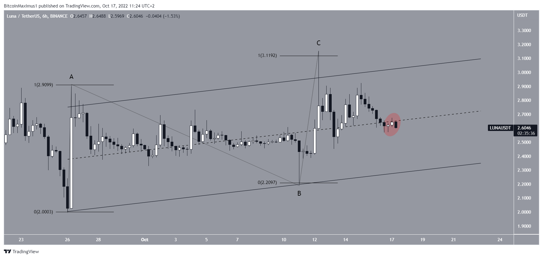Da mesma forma que a LUNA, a LUNC completou uma estrutura corretiva A-B-C a partir de 26 de setembro. No caso da LUNC, as ondas tiveram uma proporção ligeiramente superior a 1:0,618. Isso levou a uma alta de US$ 0,00037 em 2 de outubro. Desde então, o preço vem caindo abaixo de uma linha de tendência de baixa.