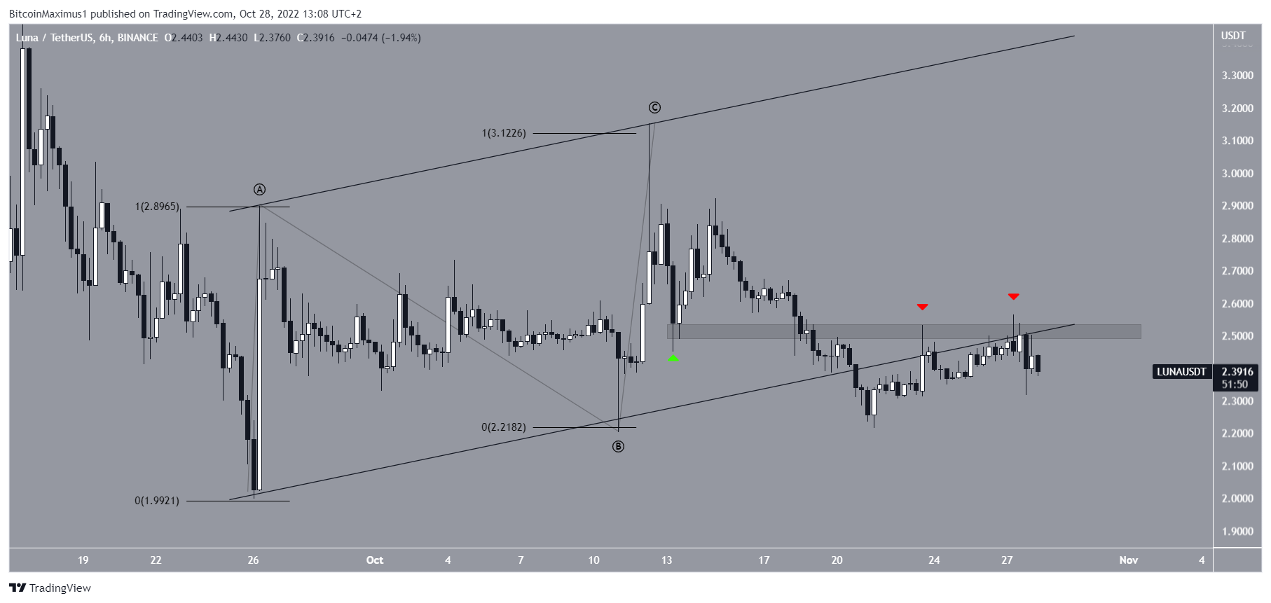 De forma semelhante a LUNA, o preço da Luna Classic completou uma estrutura A-B-C (preto) que levou a um topo de US$ 0,00038. No entanto, o preço do token não foi capaz de se manter nesse nível posteriormente (ícone vermelho) e começou a cair abaixo de uma linha de tendência de baixa.