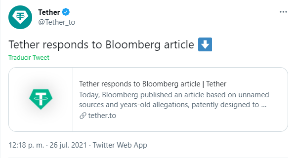 “Hoje, a Bloomberg publicou um artigo baseado em fontes anônimas e alegações de anos atrás, evidentemente destinadas a gerar cliques. Este artigo segue um padrão de reempacotar declarações desatualizadas como ‘notícias’. Os esforços contínuos para desacreditar a Tether não vão mudar nossa determinação de permanecer um líder na comunidade”.