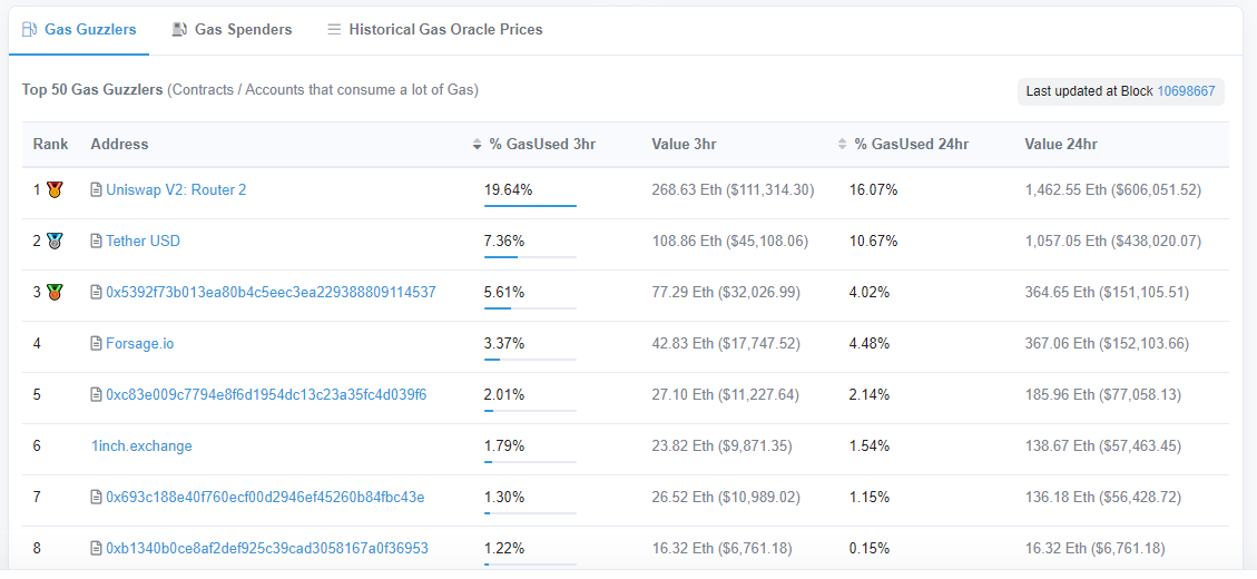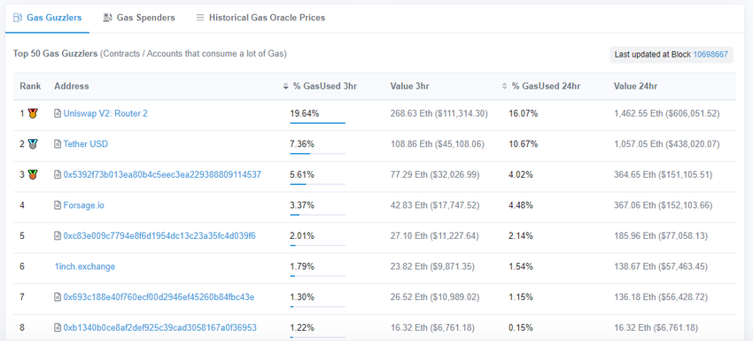 O Tether aparece em segundo lugar na lista de taxas, com 1.057,05 ETH em 24 horas e 7,37% nas últimas três horas. Essa fatia, porém, deve aumentar quando os ativos transferidos da Tron começarem a ser movimentados em Ethereum.