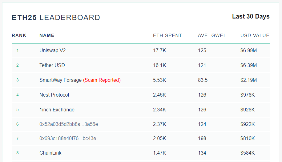 Já segundo o monitor ETH Gas Station, o USDT aparece na cola da Uniswap em taxas geradas nos últimos 30 dias. Os 1 bilhão de USDTs, portanto, podem levar a stablecoin para o topo.