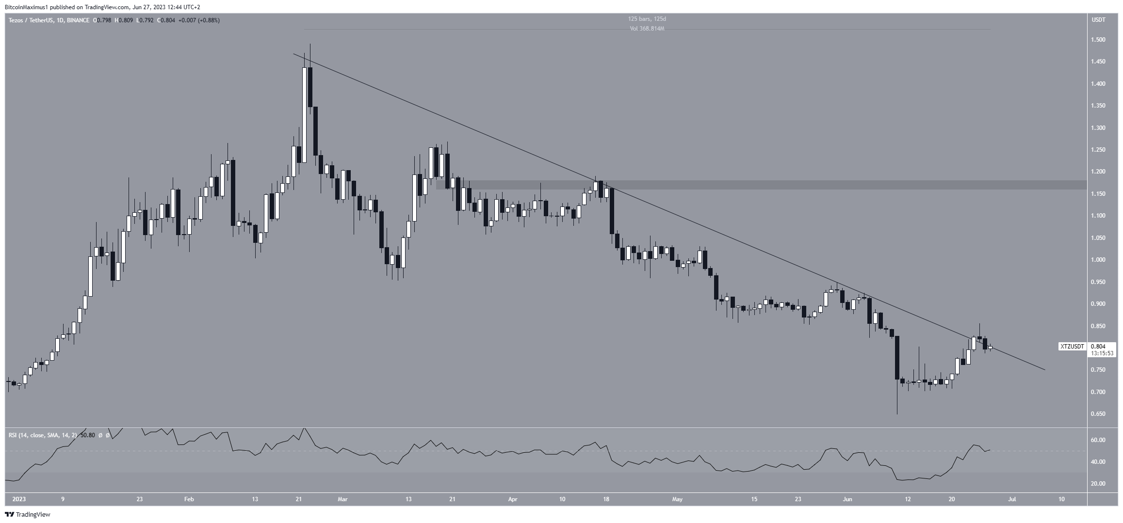 Principalmente, o XTZ é negociado abaixo de uma linha de tendência de baixa há 125 dias. Como a linha está em vigor há tanto tempo, a tendência pode ser considerada de baixa, desde que o preço seja negociado abaixo dela.