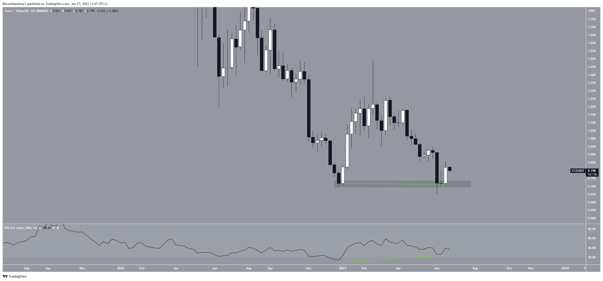 Embora o preço do XTZ não tenha subido esta semana em resposta à atualização, o movimento no gráfico semanal ainda parece otimista. Enquanto o XTZ caiu para uma nova mínima anual de US$ 0,65 em 10 de junho, ele imediatamente voltou a subir.
