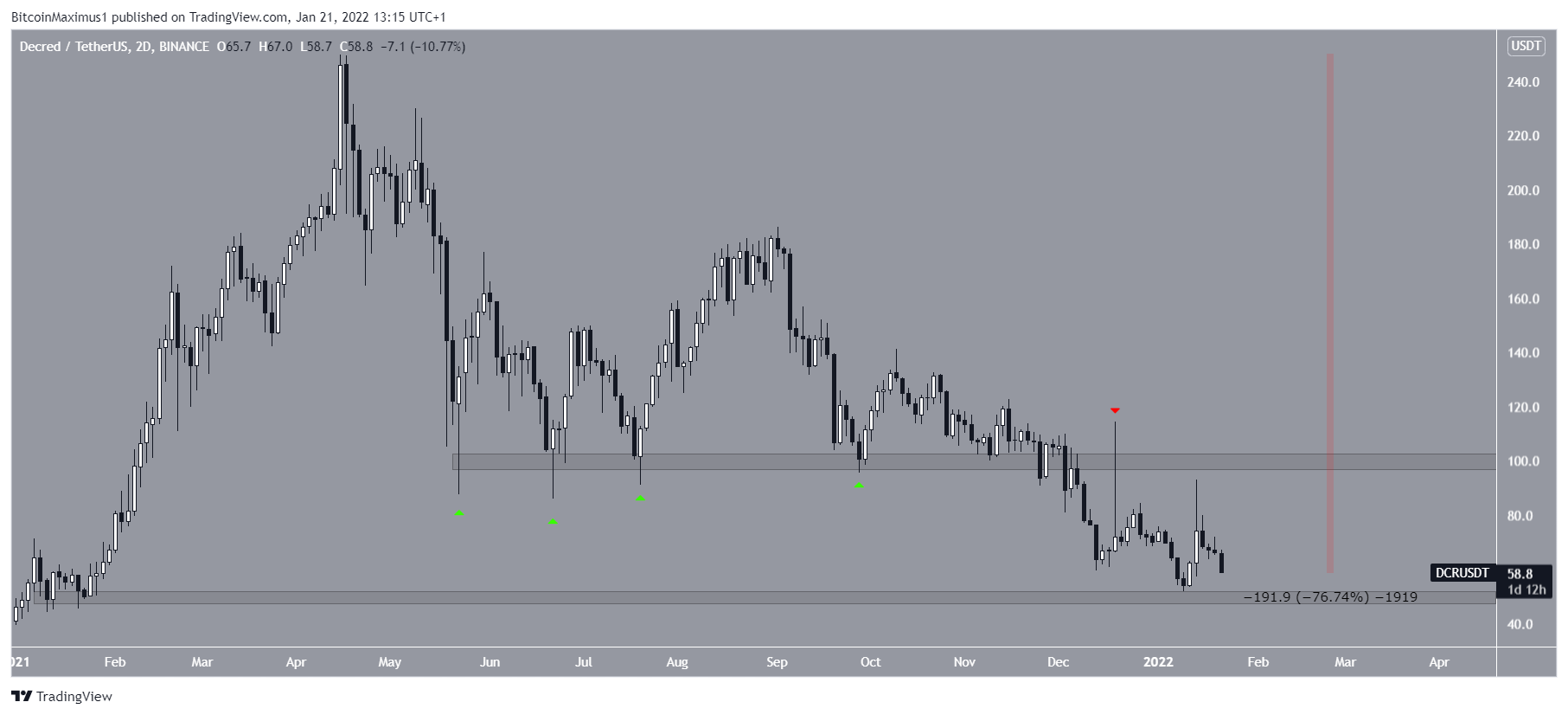 DCR estava em tendência de baixa desde que atingiu o preço recorde de US$ 250 em 14 de abril. Embora tenha saltado quatro vezes acima da área de suporte horizontal de US$ 100, o token rompeu abaixo dessa faixa de preço no dia 5 de dezembro e validou a área como suporte dez dias depois (ícone vermelho).