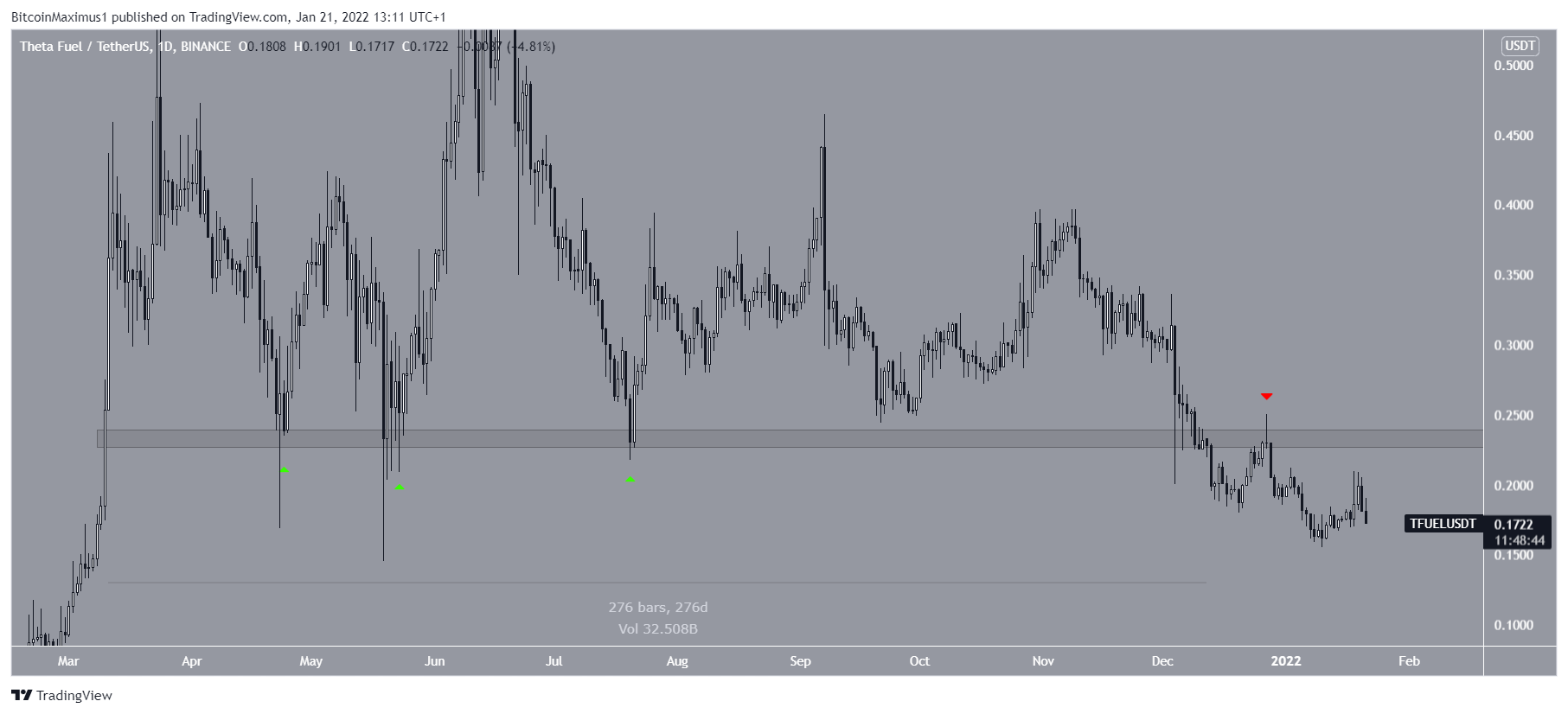 TFUEL estava acima da área horizontal de US$ 0,23 por um período de 276 dias a partir de 8 de março. O token rompeu abaixo e validou como resistência essa zona de preço (ícone vermelho) no dia 27 de dezembro e tem caído desde então.