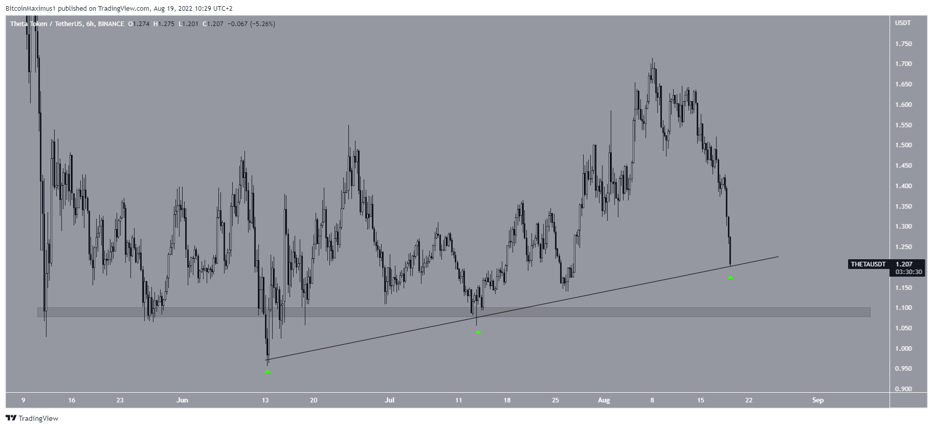 Assim como o GRT, o THETA segue uma linha de suporte ascendente desde 13 de junho. A linha foi validada pela terceira vez em 19 de agosto (ícones verdes).
