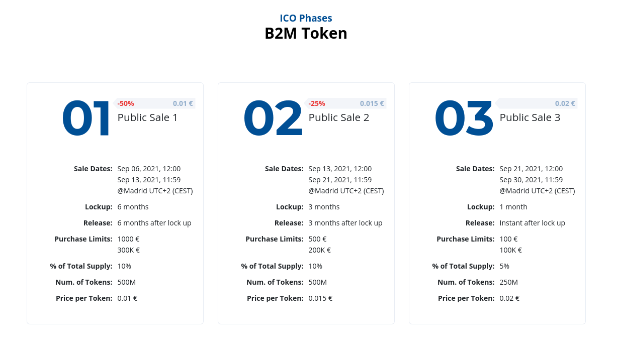 A equipe já está trabalhando bastante para lançar o ICO (Initial Coin Offer) do token, que será realizada em três fases, conforme divulgado no site oficial de lançamento do ativo. A abertura do ICO começará em 6 de setembro de 2021 e terminará em 30 de setembro. As fases da ICO incluirão 25% da emissão total de tokens planejada para B2M, com uma emissão máxima de 5 bilhões de tokens.