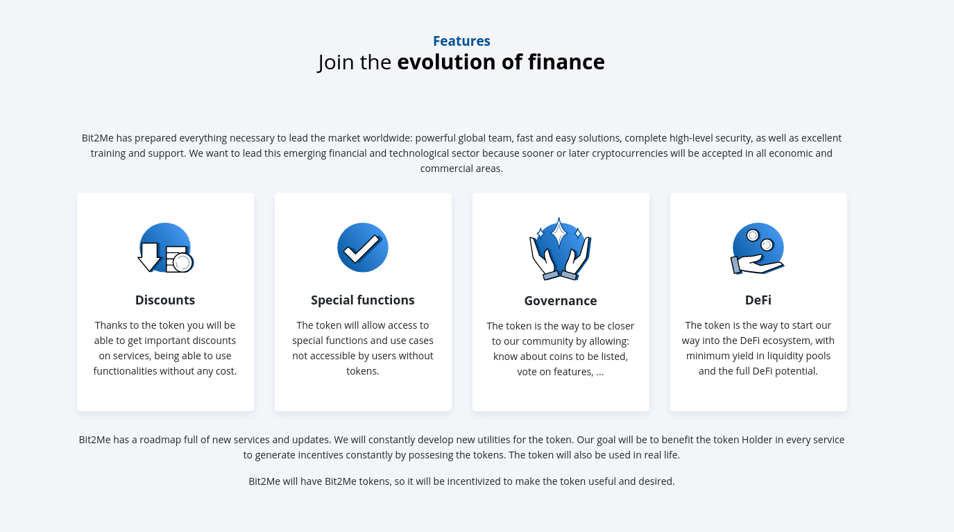 Estes serviços serão acompanhados por novos serviços controlados por token B2M, que complementarão a ampla oferta da empresa e já estão incluídos no Road Map da empresa: Cartão Bit2Me, Bit2Me Earn, Empréstimo Bit2Me, API, etc.