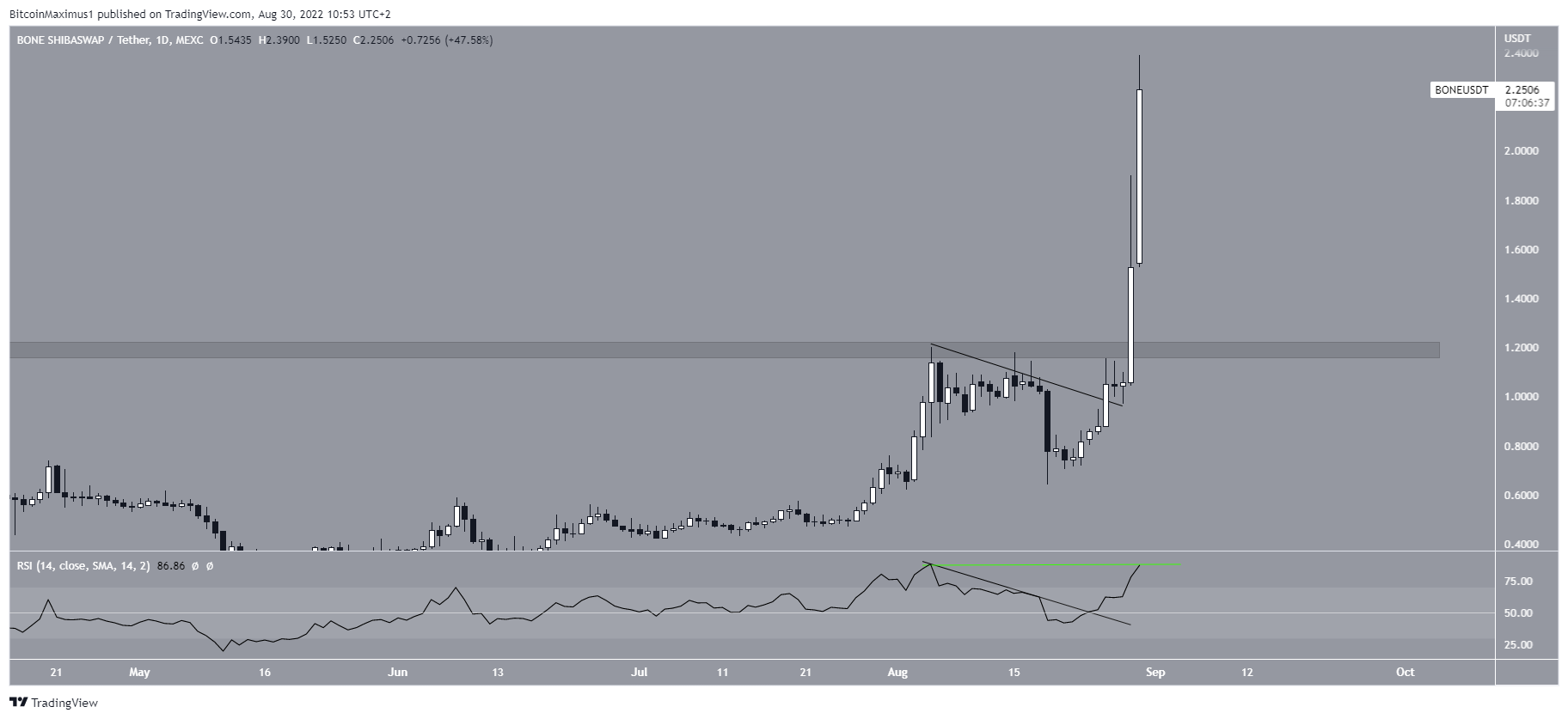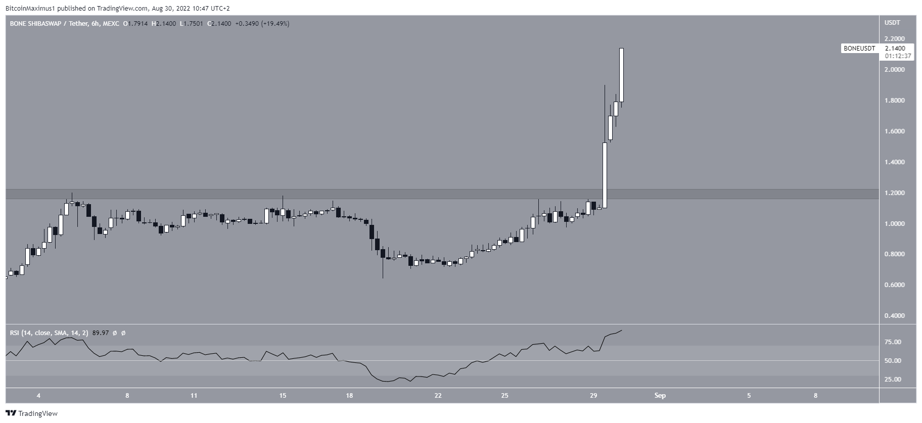 No entanto, o preço iniciou um rápido movimento de alta em 19 de agosto e conseguiu romper com sucesso essa resistência na segunda-feira (29). Ao longo desse movimento de alta, o BONE subiu 200% em 10 dias e retomou seu movimento de alta no 11º dia. A aceleração do movimento nos últimos dois dias se alinhou com a listagem do token na exchange BlueBit.