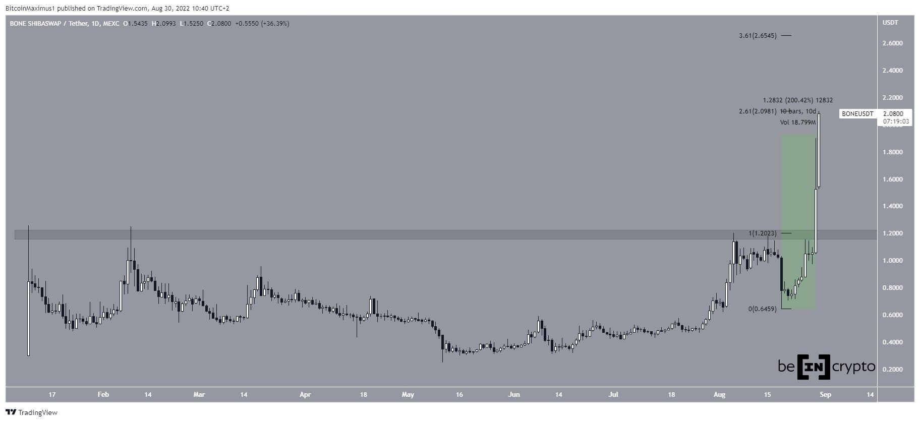 O preço da Bone ShibaSwap (BONE) tem subido a um ritmo acelerado desde 19 de agosto. Com sua alta de US$ 2,10, o token se moveu acima de um nível crucial de Fibonacci.