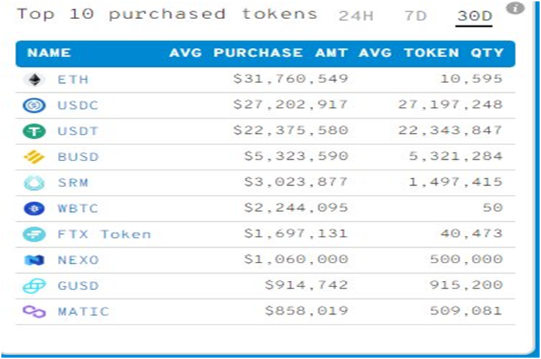 Nos últimos 30 dias, que se estendem até a primeira semana de fevereiro, o FTT se tornou a sétima criptomoeda mais comprada, com um valor médio de compra de US$ 1,6 milhão e uma quantidade média de tokens de 40.473.