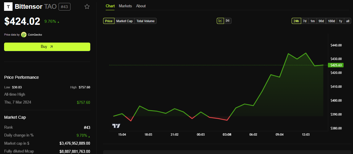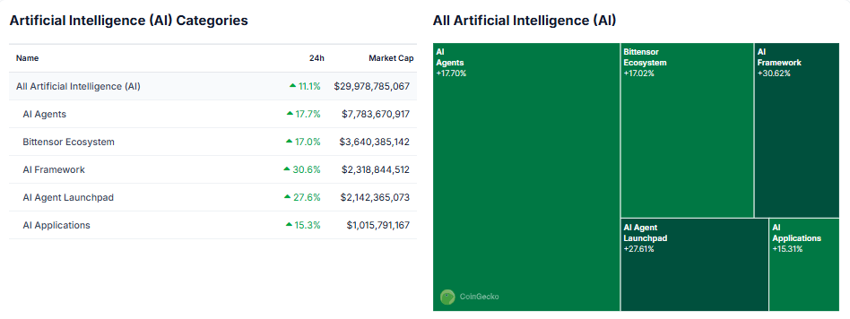 Especialistas destacaram a Bittensor (TAO) entre os tokens do setor de IA que estão em alta após a atualização dTAO. Com dados da CoinGecko mostrando o Ecossistema Bittensor subindo 17% para US$ 3,6 bilhões, um analista popular no X indica que a TAO é a moeda de IA a ser observada.