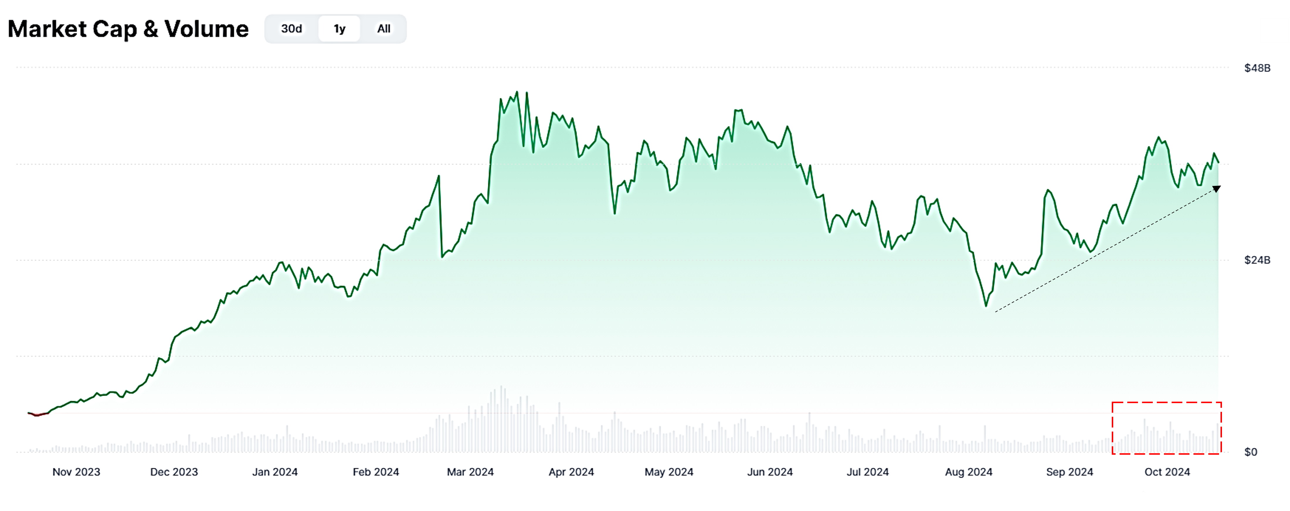 Além disso, os volumes diários de negociação para moedas de IA permaneceram consistentemente acima de US$ 2 bilhões durante todo o mês de outubro, o dobro da média dos dois meses anteriores. Esses números refletem uma demanda crescente entre os investidores por tokens de IA.