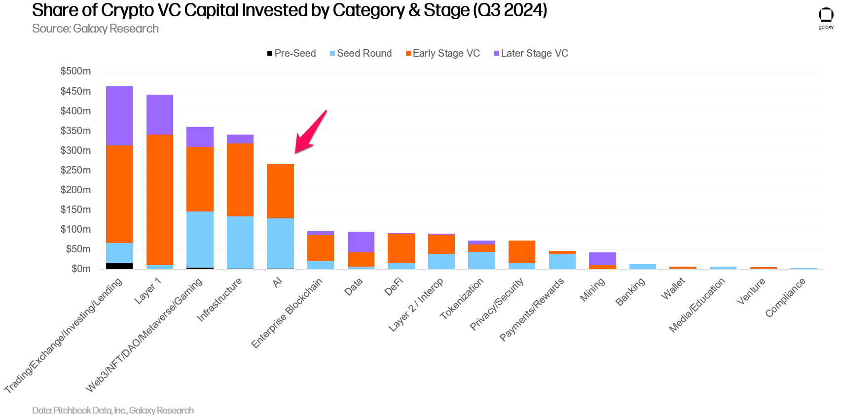 Uma diferença chave entre moedas de IA e moedas meme é o nível de interesse das empresas de capital de risco (VC). De acordo com um relatório recente da Galaxy, os VCs estão céticos sobre o valor de longo prazo das memecoins, optando por setores que acreditam ter maior potencial.