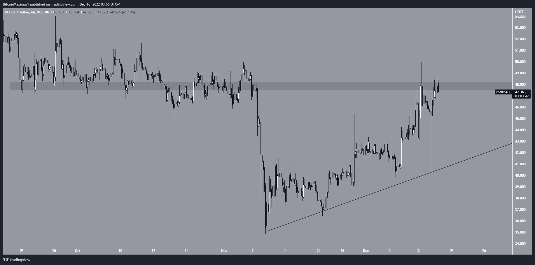 O BSV aumentou junto com uma linha de suporte ascendente desde 9 de novembro. O movimento ascendente levou a uma alta de US$ 48 em 12 de dezembro.