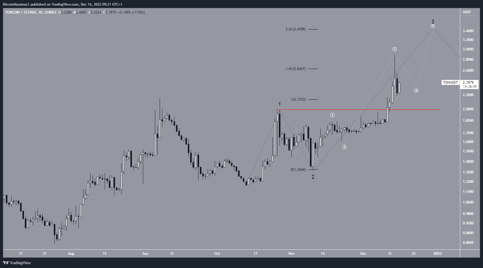 A TON aumentou desde 13 de outubro no que é provavelmente um movimento ascendente de cinco ondas (preto). Se correto, o preço está na onda três. A contagem da subonda é apresentada em branco, indicando que o preço da TON está na subonda quatro.