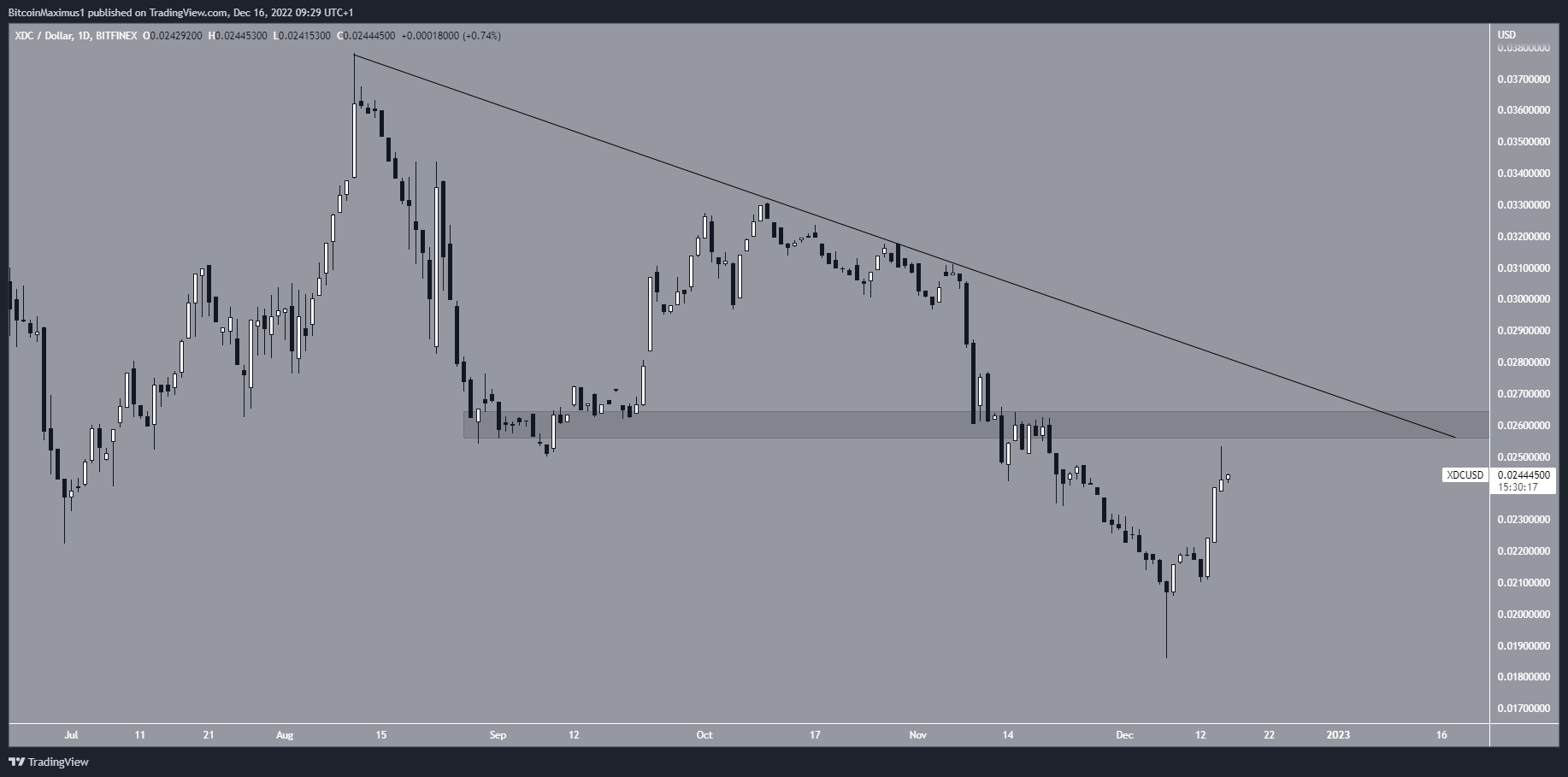 A XDC caiu abaixo de uma linha de resistência descendente desde 11 de agosto. O movimento descendente levou a uma mínima de US$ 0,018 em 7 de dezembro. O preço está subindo desde então e se aproxima da linha de resistência descendente.
