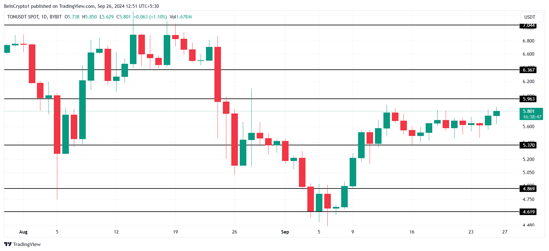O preço da Toncoin tem se consolidado entre US$ 5,96 e US$ 5,37, não sendo afetado por sinais mais amplos do mercado. Embora um rompimento dessa consolidação seja possível, os indicadores técnicos sugerem o contrário.