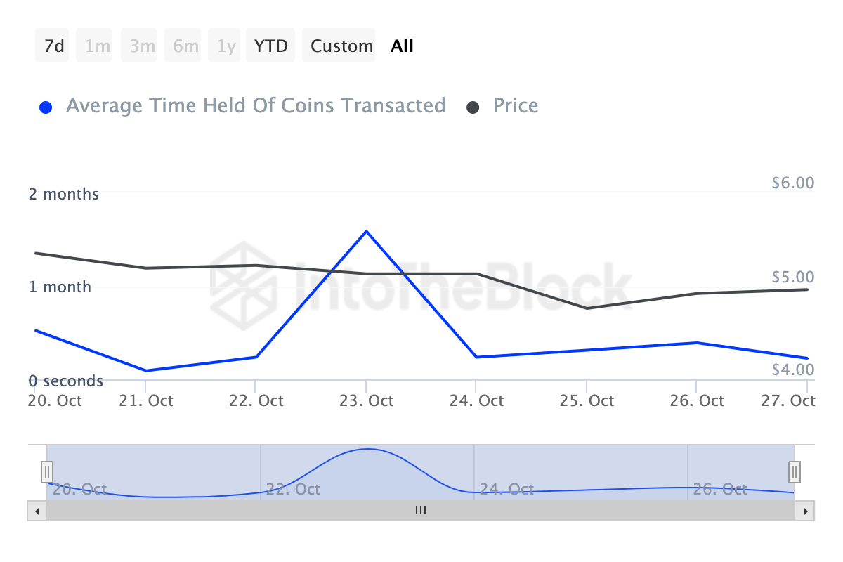 Embora o TON tenha caído abaixo de US$ 5, dados do IntoTheBlock mostram que o tempo de retenção de moedas aumentou. Nos últimos sete dias, essa métrica, que mede o tempo que uma criptomoeda foi mantida sem ser vendida, subiu 142%