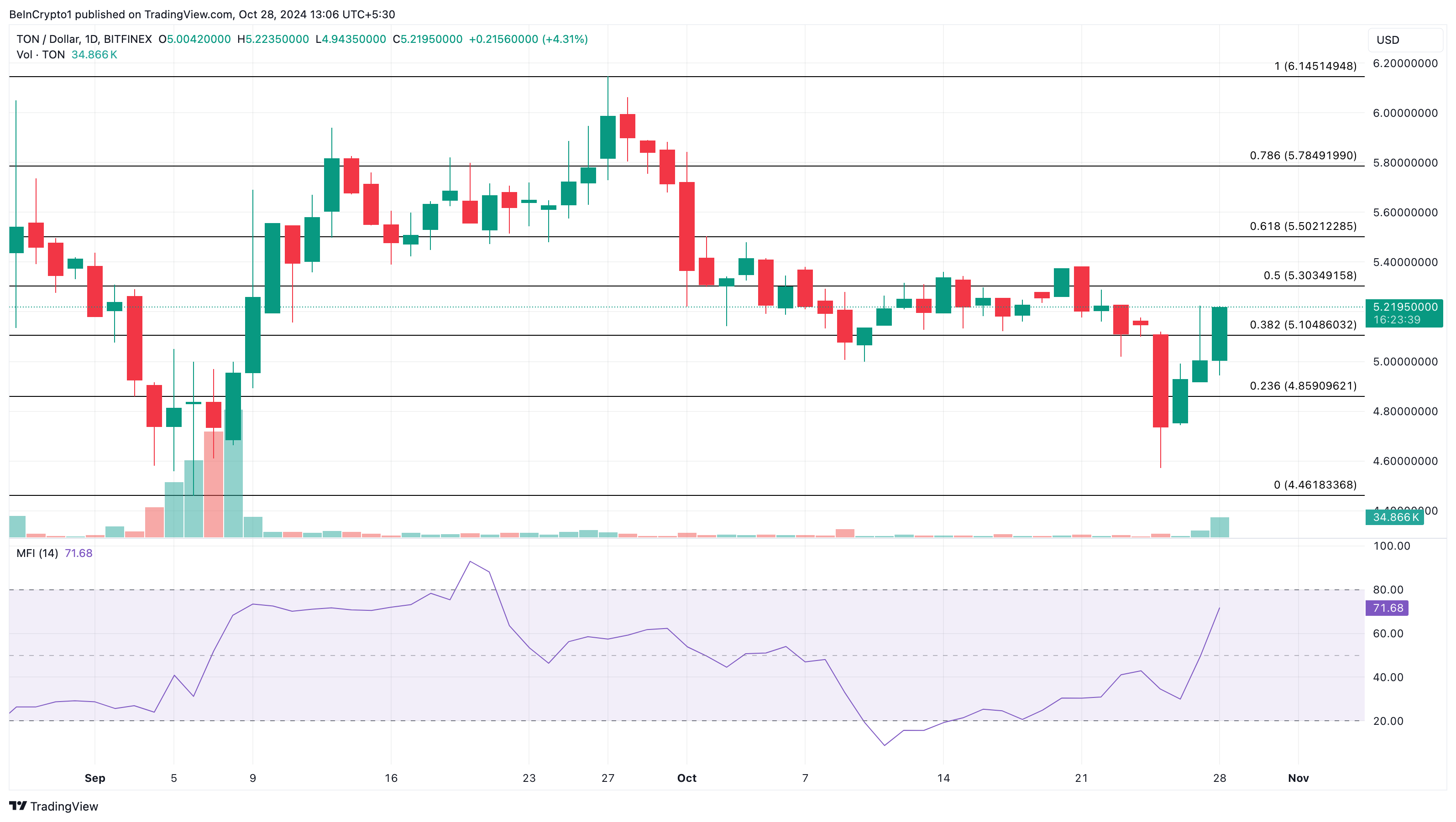 Utilizando o indicador Fibonacci — que identifica níveis-chave de suporte e resistência —, um aumento contínuo na pressão de compra poderia elevar o preço do Toncoin para US$ 6,15.