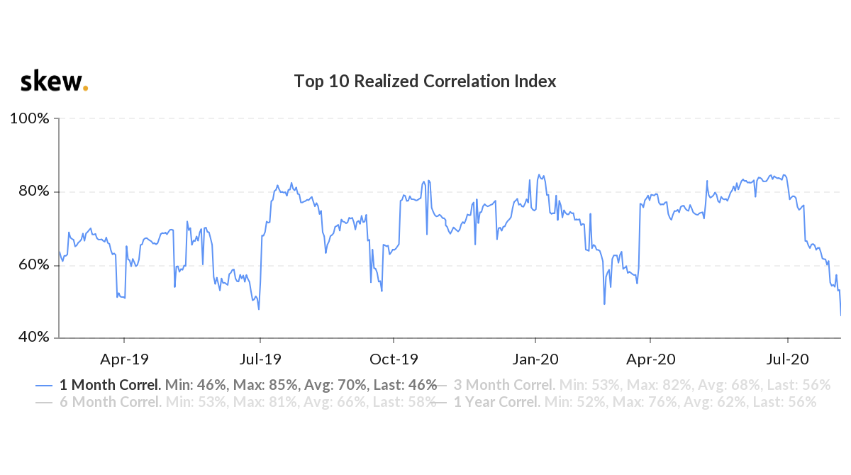 Segundo a firma de análise de dados de blockchain Skew, o índice Top 10 de Correlação Realizada registrado mensalmente está no menor nível desde que a medição começou a ser feita.