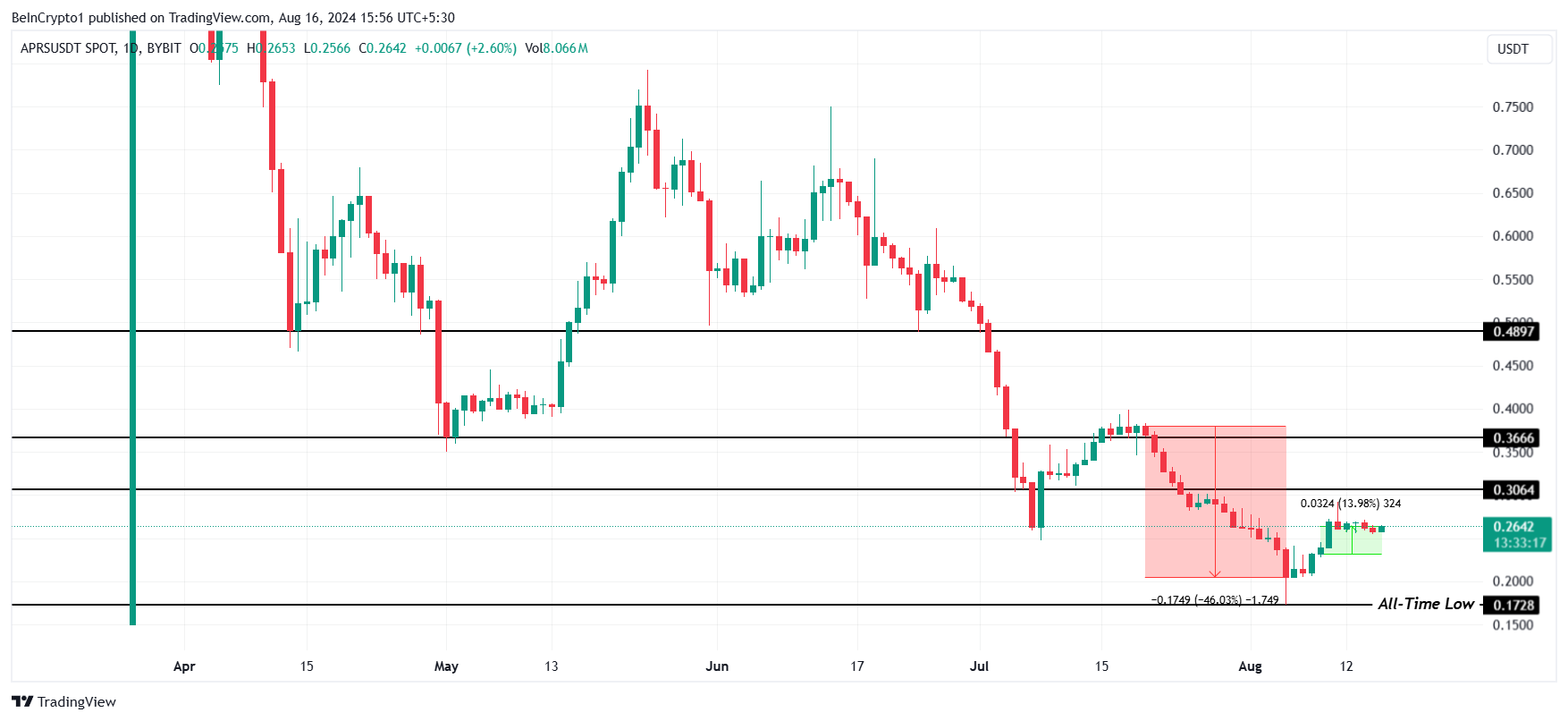 Por outro lado, a tese altista pode ser invalidada se o APRS cair abaixo de US$ 0,172. Esse preço marca uma baixa de todos os tempos para a altcoin, estabelecida durante o declínio de 46% no final de julho.