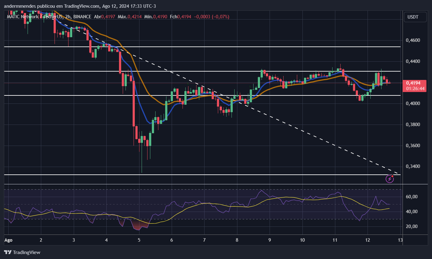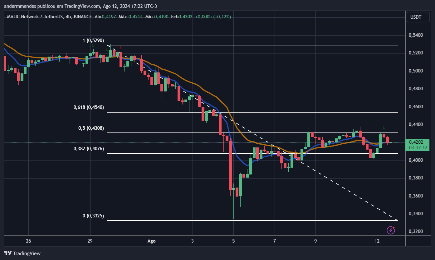 O gráfico de quatro horas mostra que a MATIC está em um período de consolidação desde 8 de agosto. Mais precisamente, a altcoin está negociada entre os níveis de US$ 0,40 e US$ 0,43.