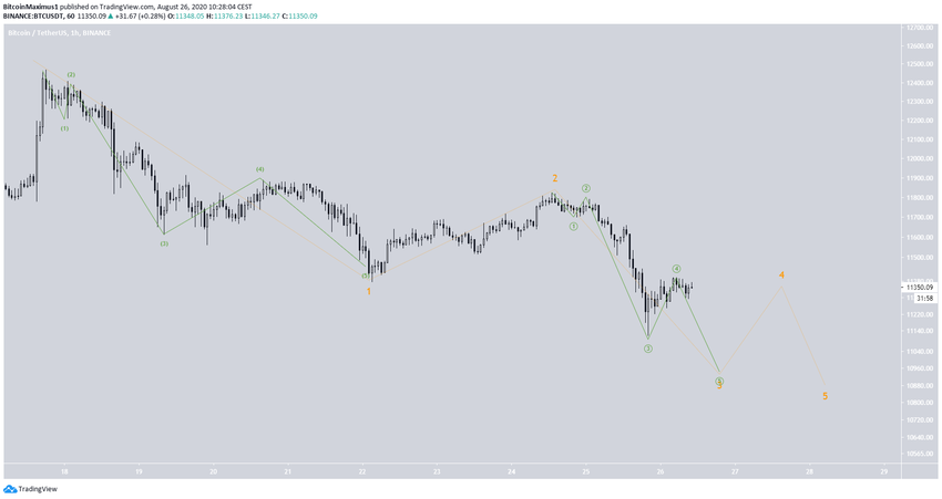O cenário mais provável é que o preço esteja na onda 4 de uma formação de cinco ondas (em preto abaixo). Como a onda 2 terminou no nível de 0,618 de Fibo, faria sentido que a onda 4 terminasse no nível de 0,382 de Fibo em $ 10.945. Isso coincide com o nível de suporte mencionado anteriormente no período diário.