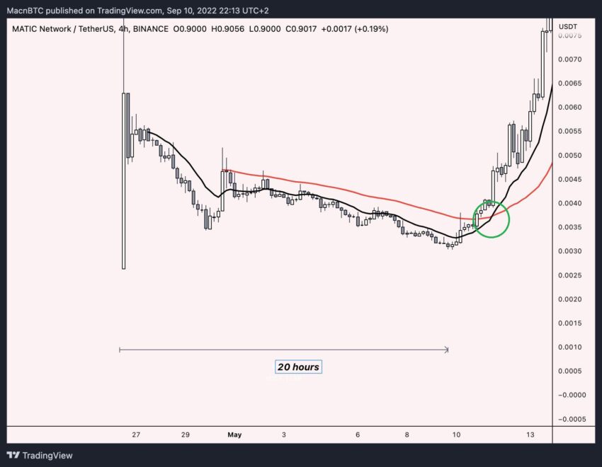 Ambos os sinais eram visíveis a MATIC. Após sua listagem, o token caiu por um período de aproximadamente 20 horas. Então, o preço iniciou um salto maciço quando as MAs de curto (vermelho) e longo prazo (preto) fizeram um cruzamento de alta (ícone verde).
