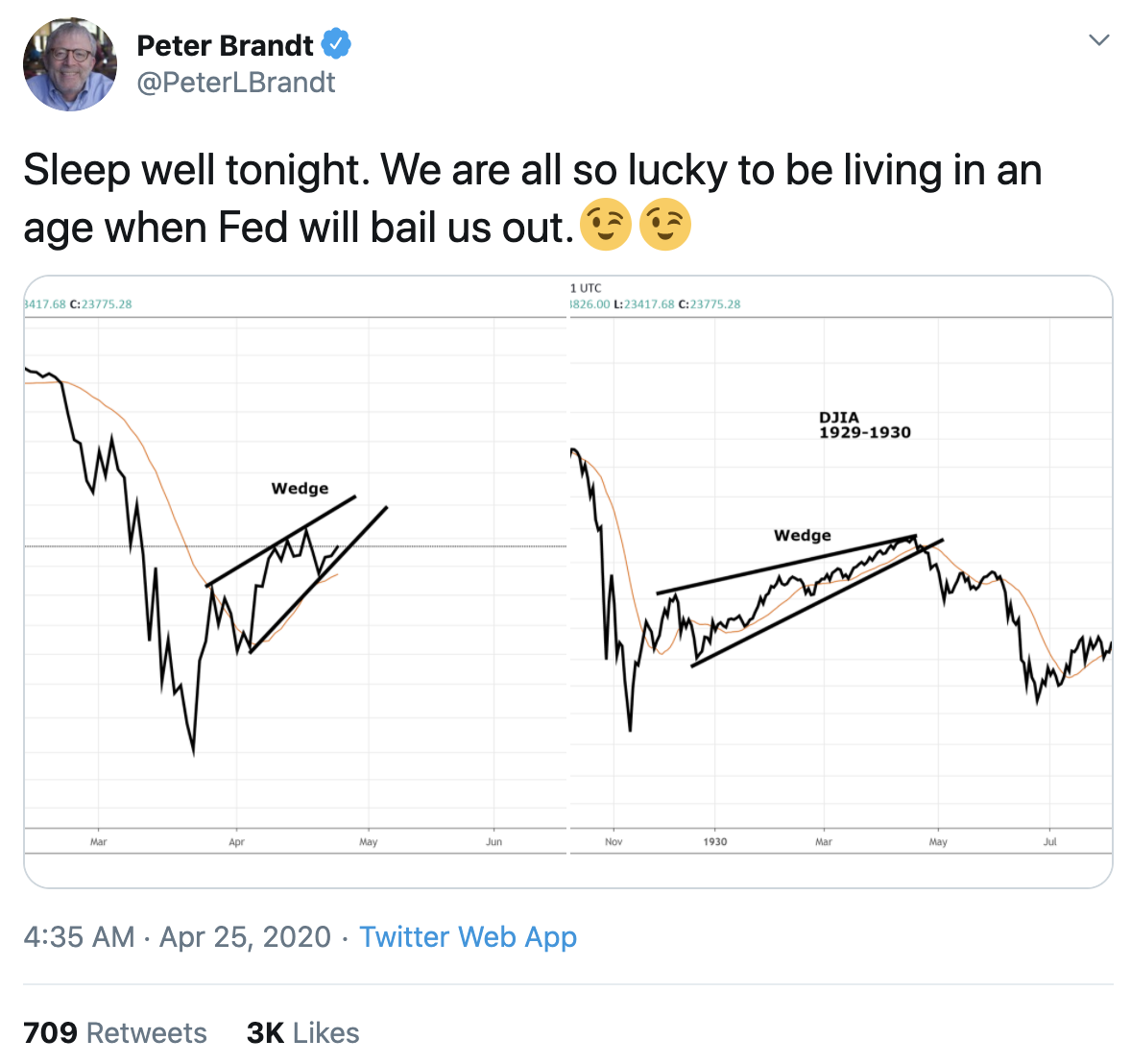 A cunha crescente é semelhante ao que a Dow Jones formou em 1929-30, Brandt ilustra com um gráfico. A situação hoje reflete os movimentos do mercado de 1929; nesse caso, podemos esperar que os mercados entrem em colapso neste verão. Ele compara os mercados hoje e 1929 lado a lado neste recente tweet.