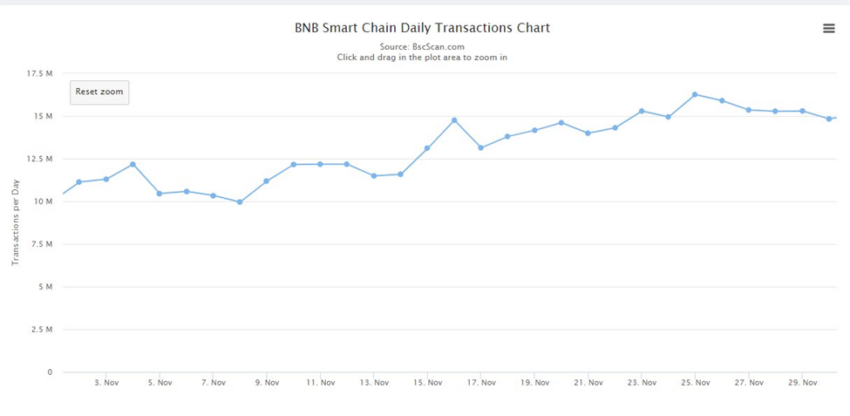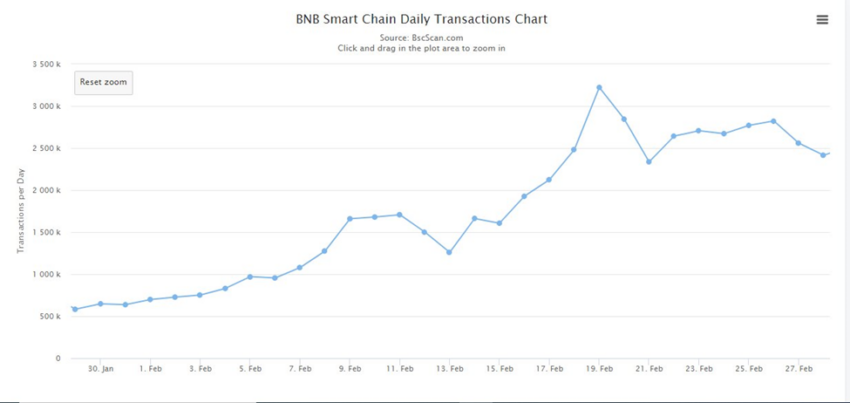 Em janeiro de 2022, a Binance Smart Chain teve uma contagem total de transações de aproximadamente 192.096.842 (192 milhões). Em contraste com a queda das transações do Ethereum em fevereiro, a blockchain registrou um aumento mensal ano a ano em fevereiro.