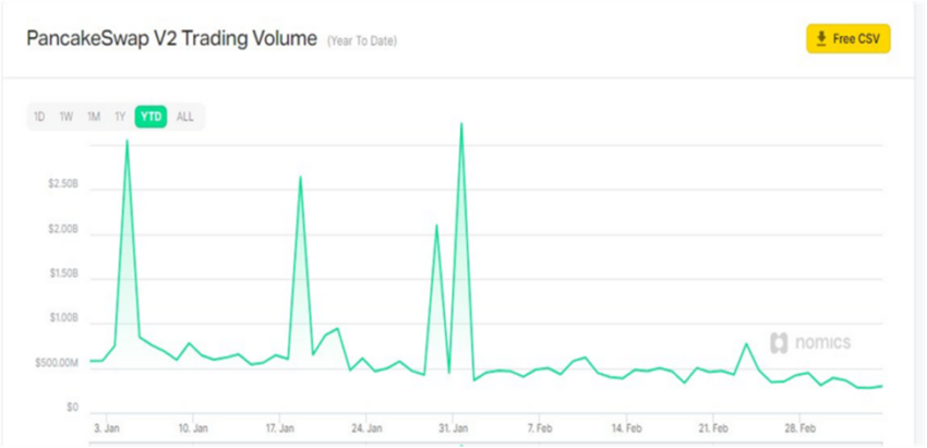 Por outro lado, a Binance Smart Chain também sofreu a diminuição da contagem de transações em grande parte devido à diminuição do uso de seu principal dApp, o PancakeSwap. Eventualmente, a queda na contagem de transações fez com que a exchange descentralizada diminuísse seu volume de US$ 25,25 bilhões em janeiro para US$ 15,73 bilhões, uma redução de 37% no espaço de 28 dias.