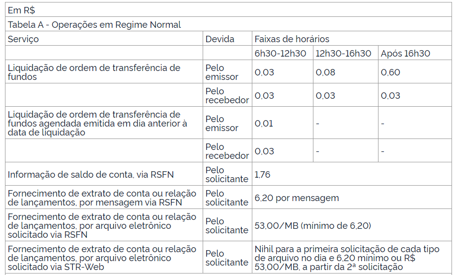 Segundo a tabela, o sistema irá cobrar a partir de R$ 0,01 para liquidar uma transação na rede. O preço mais baixo vale para transferências agendadas no dia anterior à liquidação e com custo arcado pelo emissor.