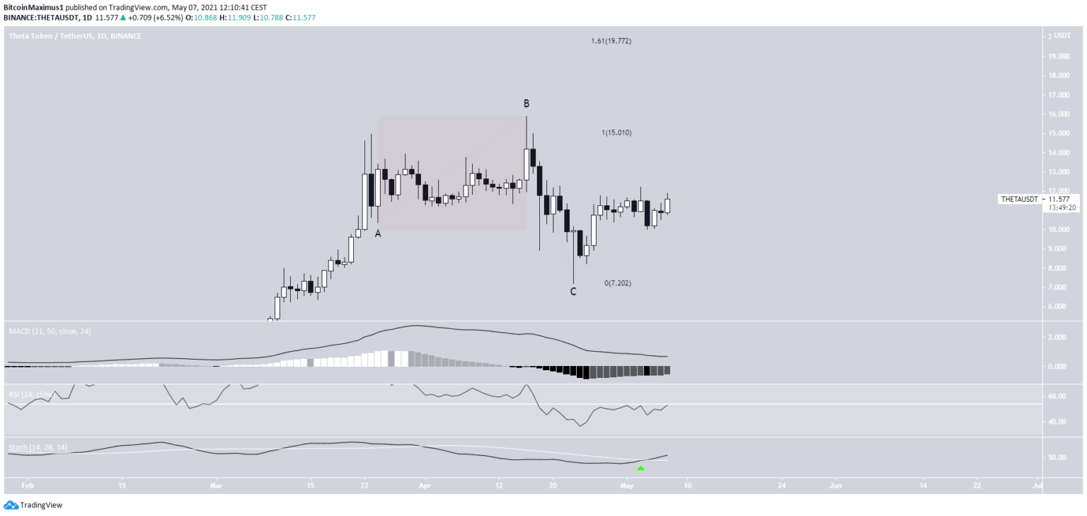 A THETA tem caído desde que atingiu a sua máxima histórica de US$ 15,88 no dia 16 de abril. No entanto, o ativo saltou logo após atingir a mínima de US$ 7,20 em 22 de abril.