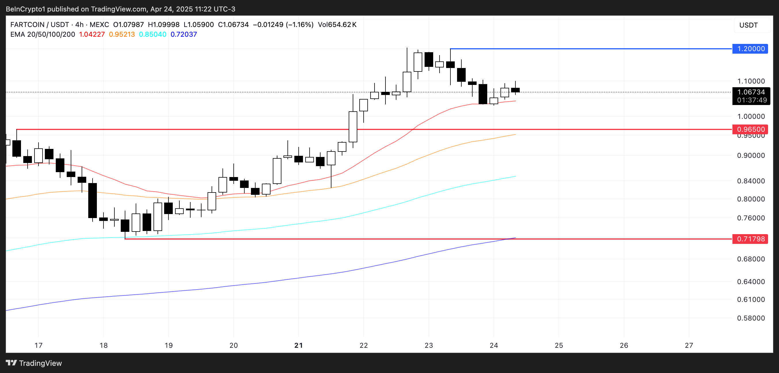 Sponsored SponsoredDe um ponto de vista técnico, o gráfico da FARTCOIN permanece otimista, com suas linhas EMA confirmando o impulso ascendente, já que as médias de curto prazo permanecem acima das de longo prazo.