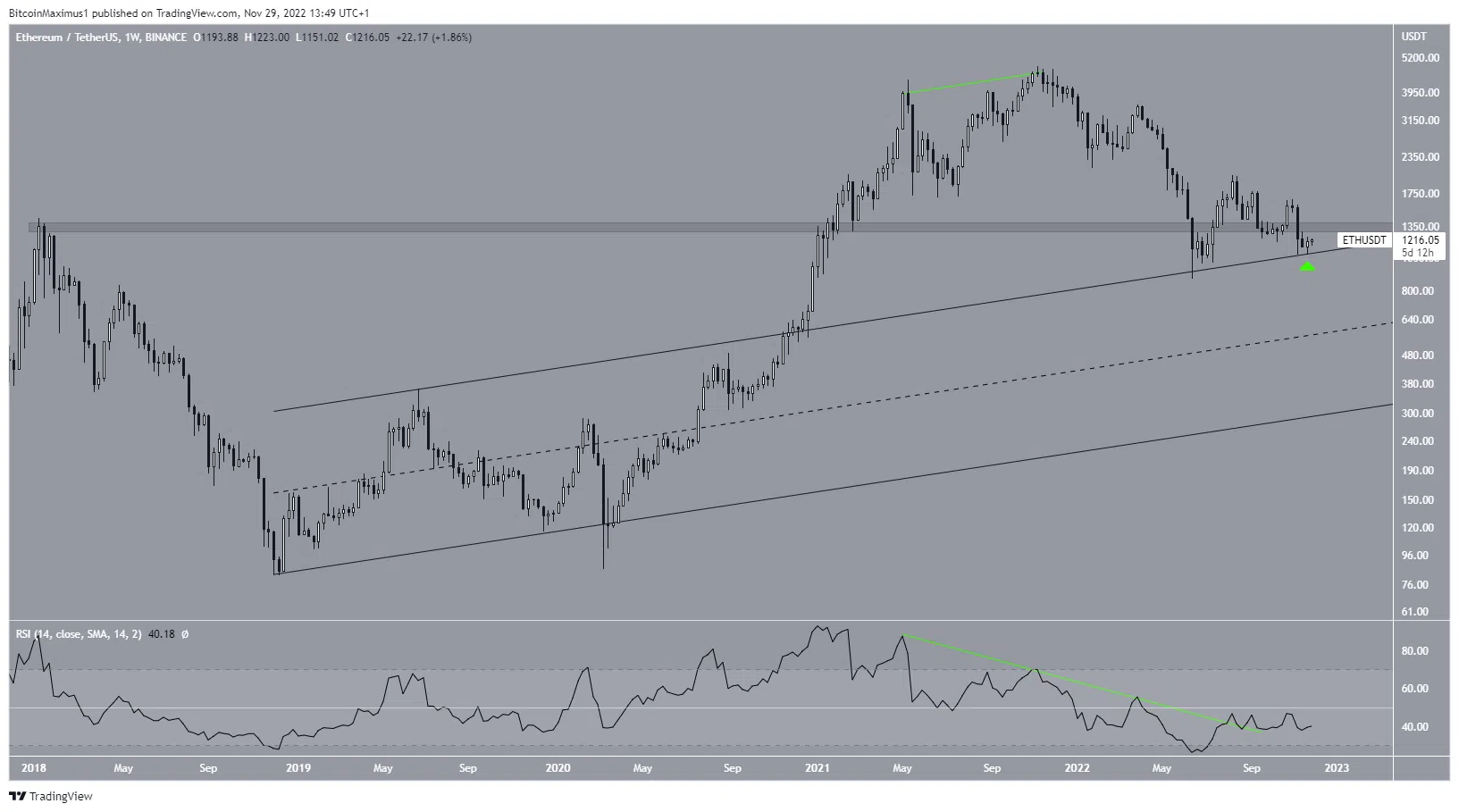 Ao contrário do Bitcoin, o preço do Ethereum não quebrou sua mínima anual em novembro. Pelo contrário, a ação do preço tem sido relativamente alta desde então e criou uma mínima mais alta (ícone verde). Essas duas mínimas também validaram um canal paralelo ascendente de longo prazo.