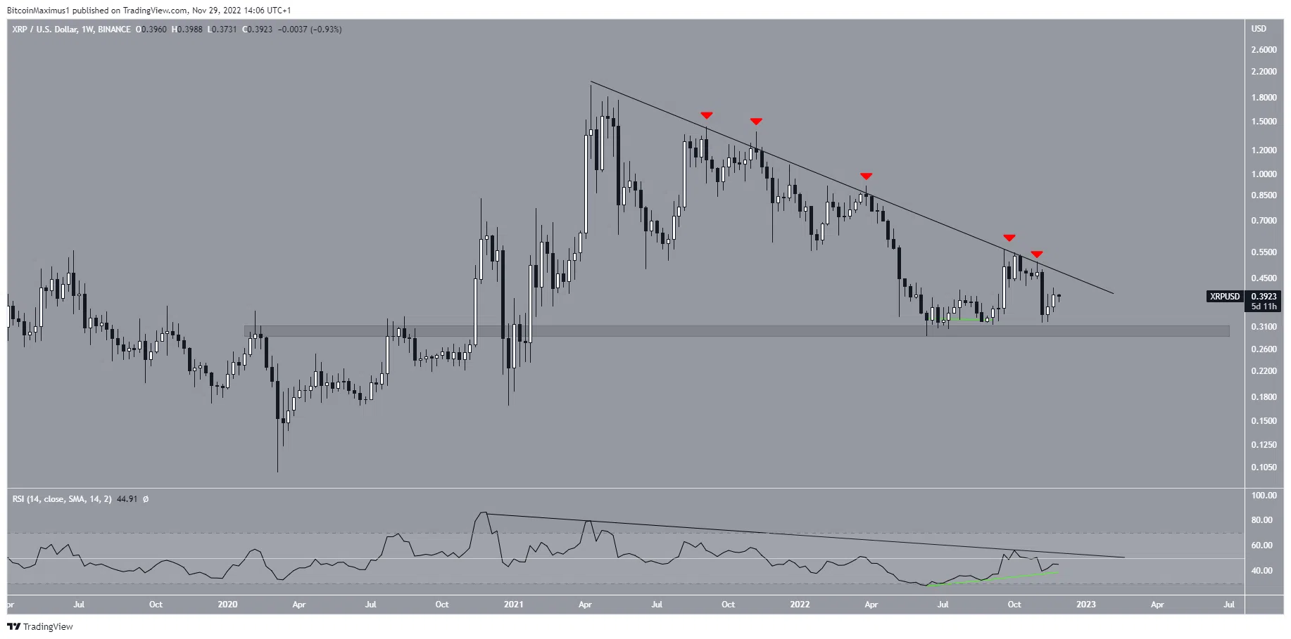 O preço do XRP caiu abaixo de uma linha de resistência descendente desde abril de 2021. A linha foi validada várias vezes (ícones vermelhos), mais recentemente em outubro de 2022.