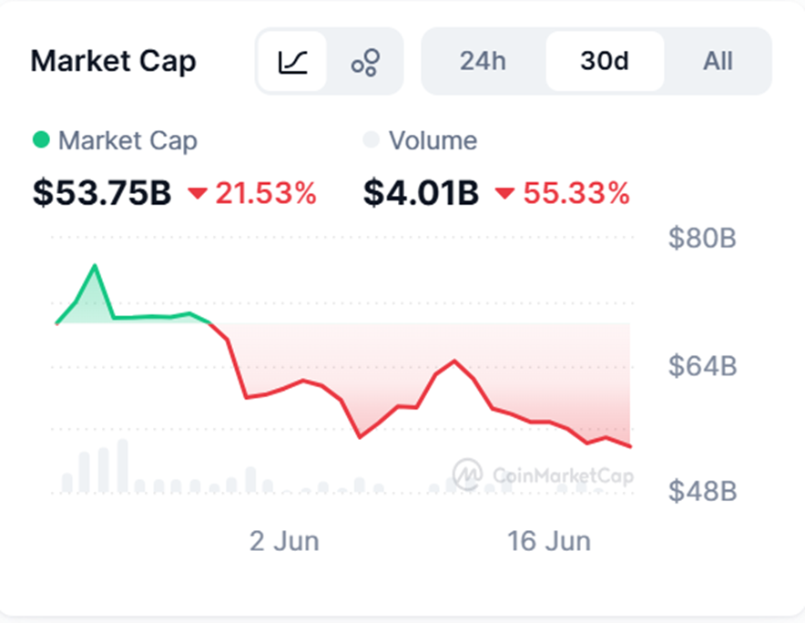 Enquanto a TRX acumulou alta de 12% desde maio, a Dogecoin recuou mais de 30%, pressionada pela queda no interesse por memecoins.
