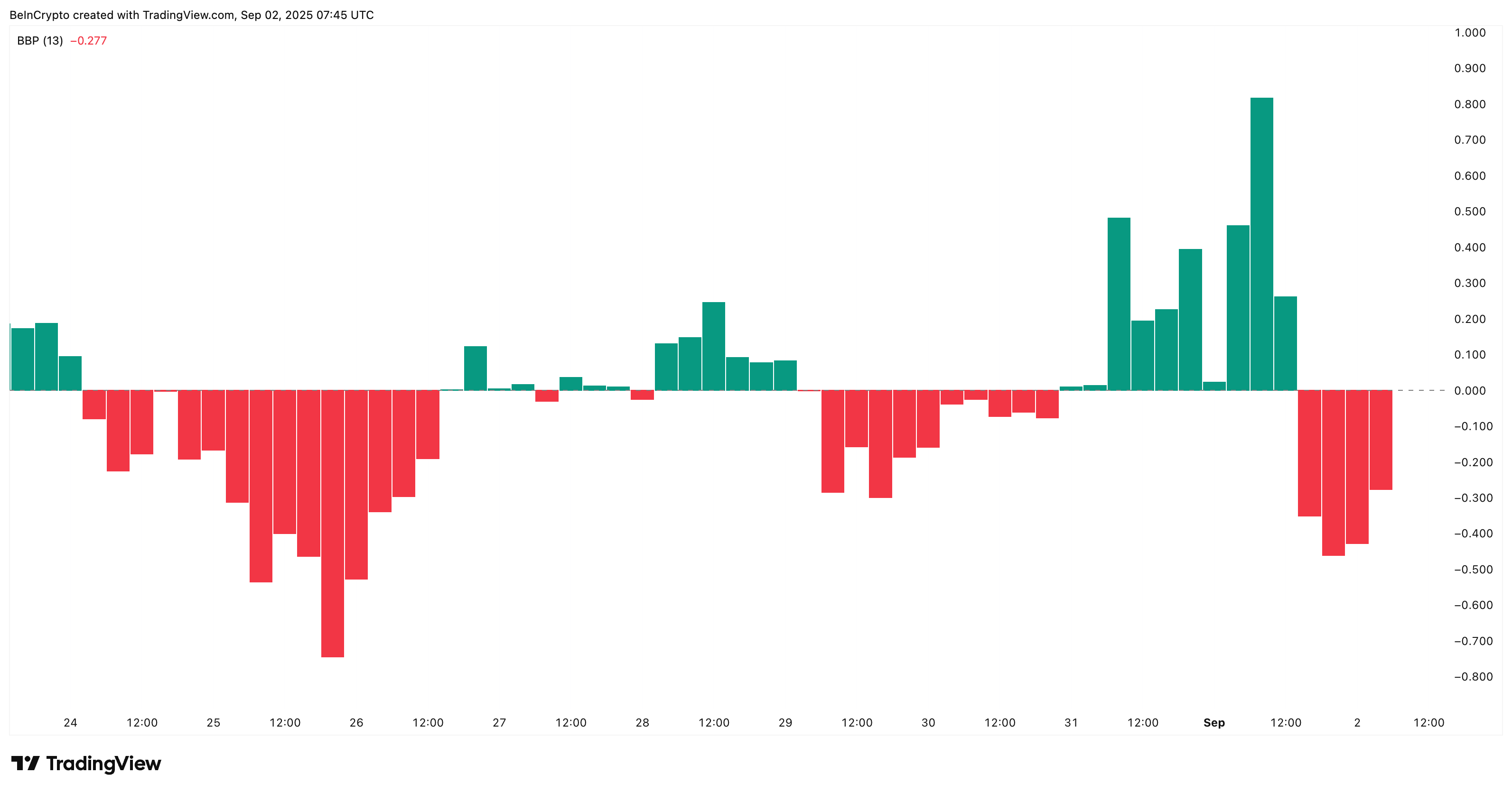 Isso está alinhado com o gráfico de 4 horas, onde o poder de compra-venda — um indicador que mede se a pressão de compra ou venda domina — tem diminuído constantemente desde 1º de setembro.