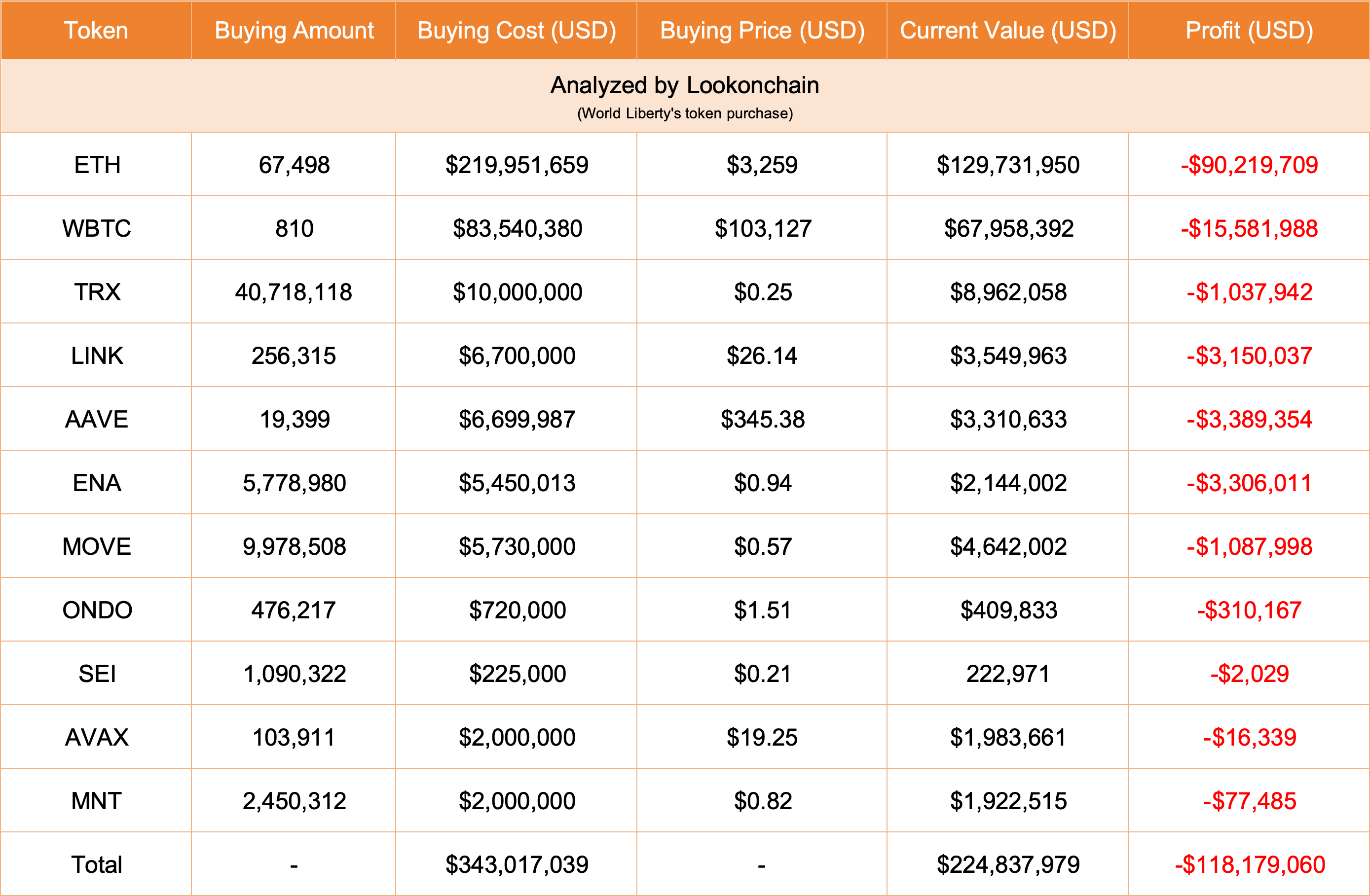 Apesar de sua expansão agressiva, as participações da WLFI permanecem no vermelho. Dados da Lookonchain estimam uma perda não realizada de cerca de US$ 118 milhões, com o Ethereum sozinho representando um déficit de US$ 88 milhões.