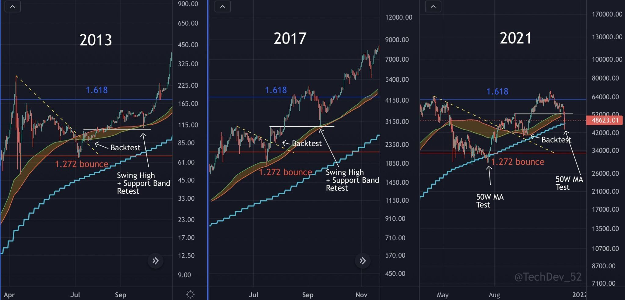 Uma dessas análises foi publicada no domingo (5) no Twitter pelo analista @TechDev_52. Ele compara aspectos técnicos da estrutura fractal do ciclo atual com os últimos dois ciclos de alta. Em todos os casos, o período interessante é quando a macro resistência da retração externa de 1,618 de Fibonacci é alcançada, medindo desde o pico do mercado em alta anterior até o fundo do próximo ciclo.