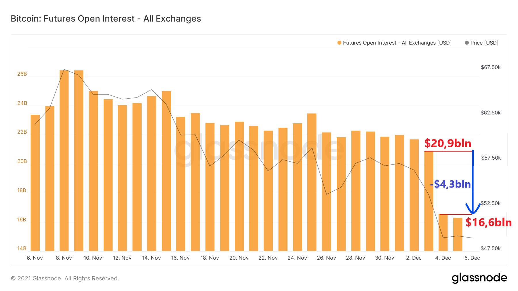 Analisando a mudança no gráfico de contratos futuros em aberto entre 3 e 4 de dezembro, é possível observar a escala dessas liquidações. Acontece que as posições totais dos traders foram reduzidas em impressionantes US$ 4,3 bilhões em um único dia. Isso representa uma queda de até 20,5% – de US$ 20,9 bilhões para US$ 16,6 bilhões.