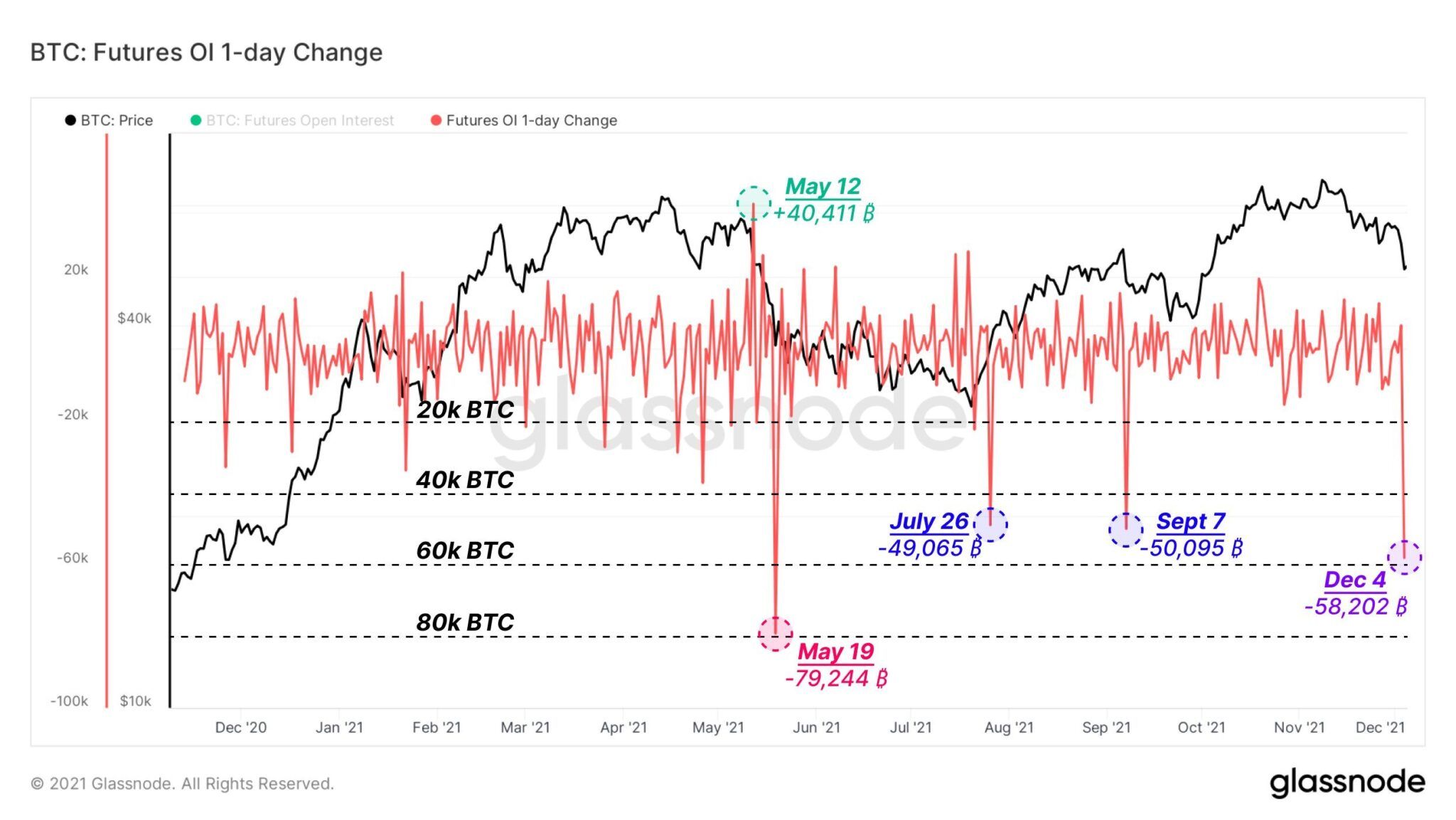 A queda do Bitcoin para a mínima de US$ 42.000 foi impulsionada por uma cascata de liquidações de posições compradas nos mercados futuros. O analista @TXMCtrades tuitou um gráfico da mudança de 1 dia nos contratos em aberto para todo o ano de 2021.