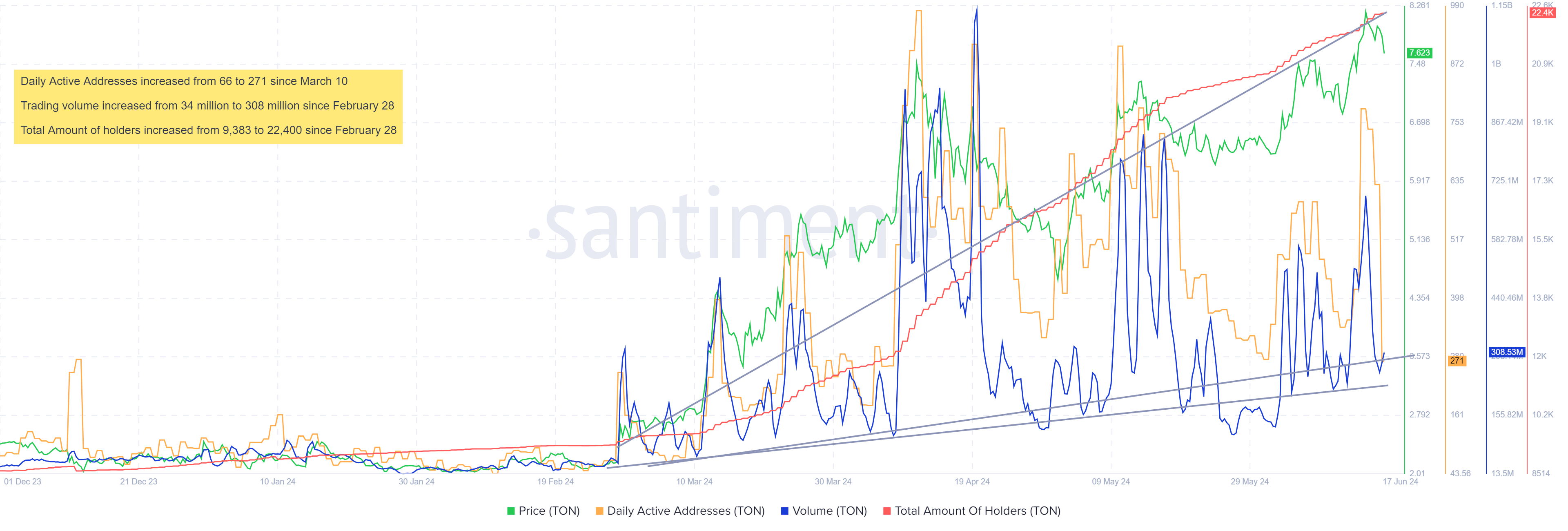 Além disso, outro fator fundamental de alta para a TON é o recente investimento da Pantera Capital. A empresa de capital de risco injetou uma quantia não revelada na TON. Marcando, assim, um marco significativo à medida que a TON continua a ganhar força na ampla base de usuários do Telegram.