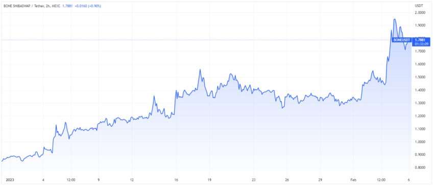O token BONE acumula alta de 120% no acumulado do ano, passando de US$ 0,873 para cerca de US$ 1,953. Esse movimento representa um salto enorme, com grande parte desse desempenho sendo feito no início deste mês.