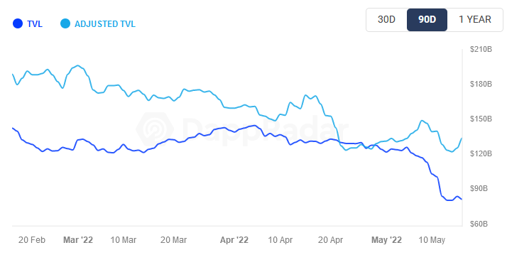 Segundo o DappRadar, o maior fluxo de retirada de investimentos foi visto durante a semana passada, quando o valor depositado em protocolos DeFi caiu mais de 40%. Não por coincidência, foi neste mesmo período que houve o colapso do ecossistema Terra, que levou os preços dos tokens LUNA e UST para quase zero.