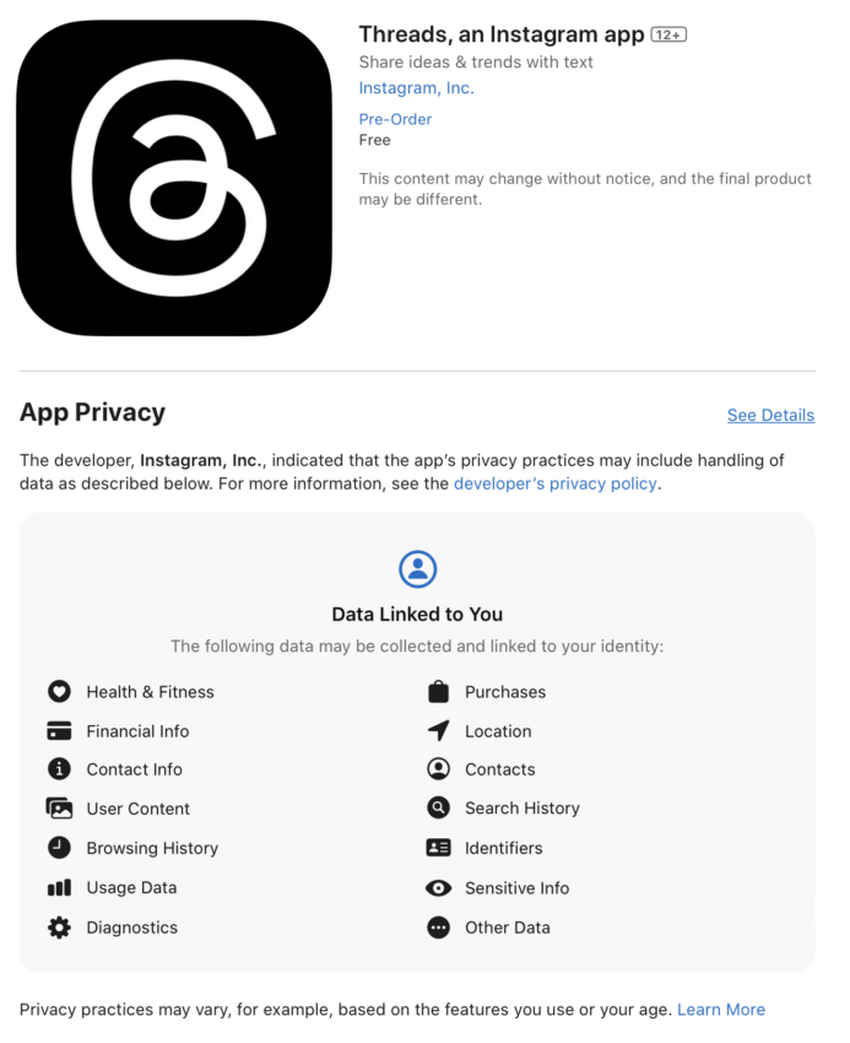 O Threads inclui coleta de dados relacionados à saúde, informações financeiras, informações de contato, histórico de navegação, localização, compras e muito mais.