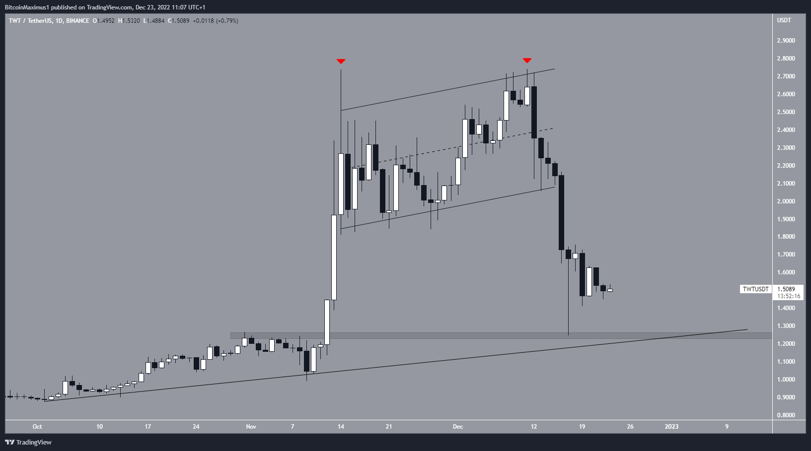 O preço do TWT está em tendência de baixa desde a conclusão de um padrão de topo duplo (ícones vermelhos) em 11 de dezembro. O token caiu abaixo de uma linha de tendência de alta cinco dias depois e atingiu uma mínima de US$ 1,24 em 17 de dezembro.